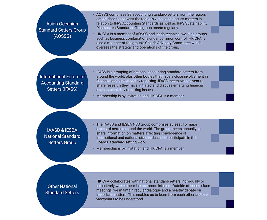 - HKICPA actively participates in and presents key topics at standard-setting meetings hosted by the Boards, including the IFRS Foundation's World Standard Setters conference, the IASB's Accounting Standards Advisory Forum (as a technical leader of the Asian-Oceanian Standard-Setters Group), and the IAASB and IESBA's National Standard Setters Meeting.