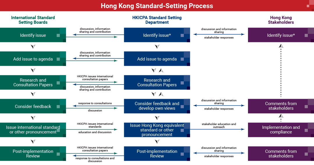 After extensive consultation on convergence, in the early 2000s, the Institute Council decided that Hong Kong standards should fully converge with international standards. Our due process documents explain our procedures for developing and adopting international standards. In summary, the process for setting standards is illustrated in the diagram below.