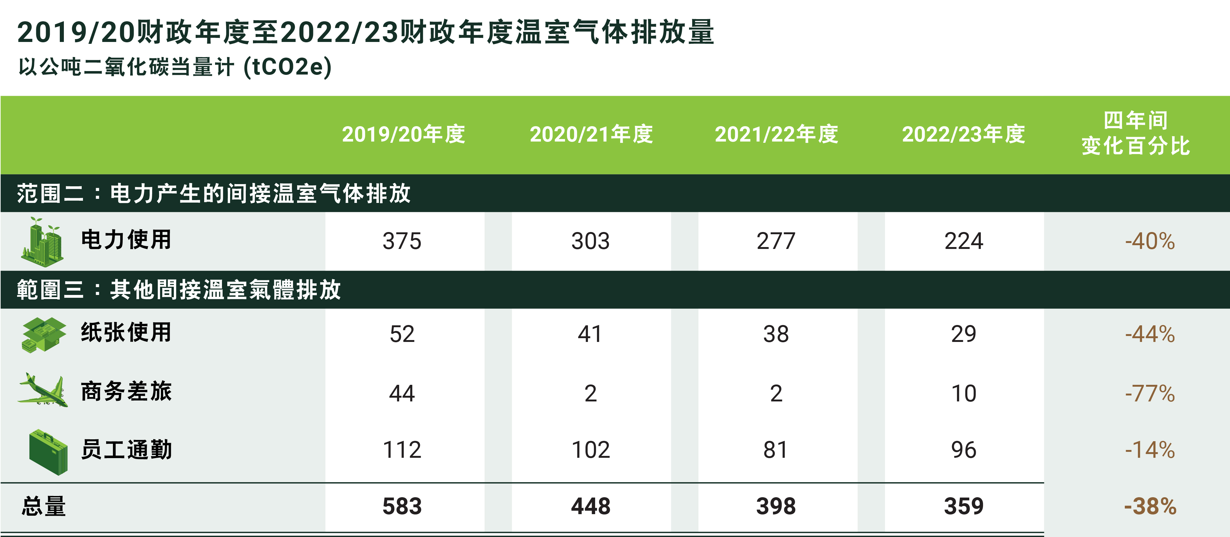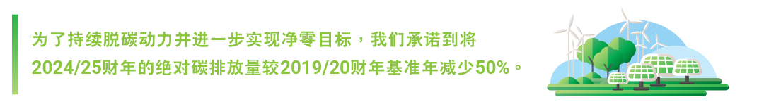 与公会首次设定温室气体减排目标的2019/20财政年度基准年相比整体上有所减少,反映在营运及实务多个范畴取得进展,尤其是在以下方面的营运及行为变化影响特别深远: