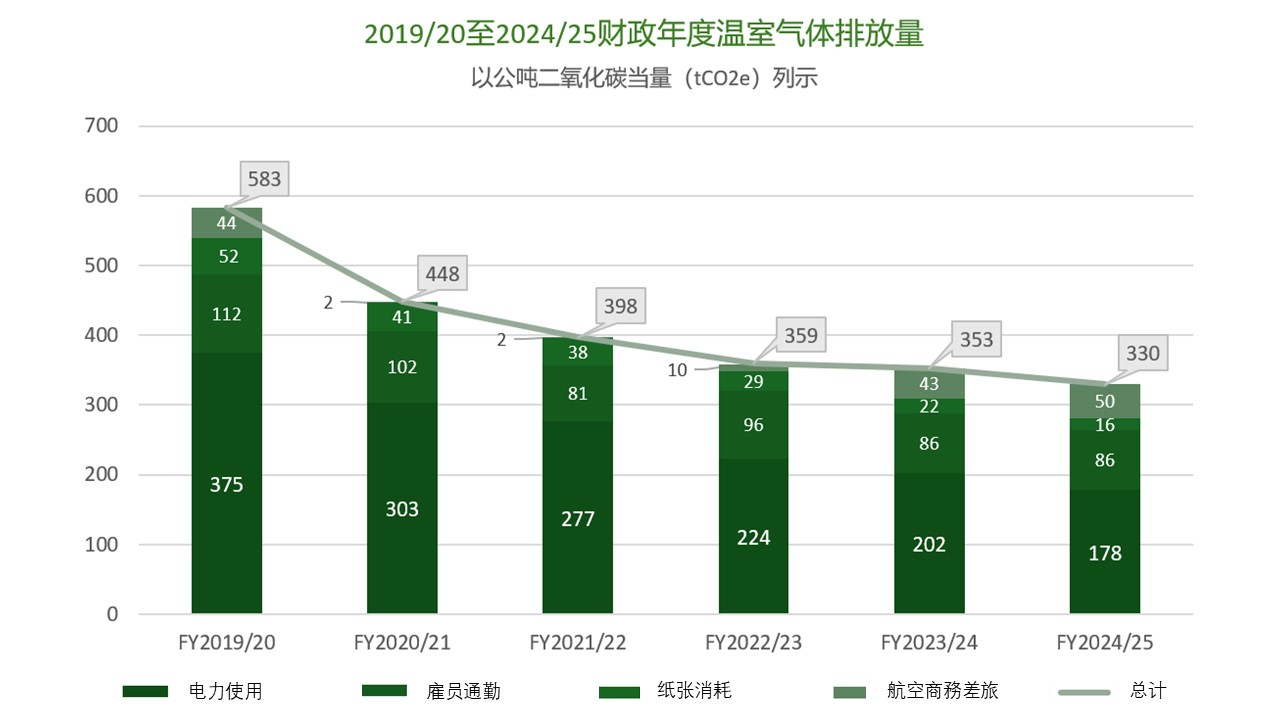 于2024/25财政年度,温室气体总排放量为330公吨二氧化碳当量,较2023/24财政年度的353公吨二氧化碳当量减少7%,较2019/20财政年度的583公吨二氧化碳当量减少43%(见下图)。