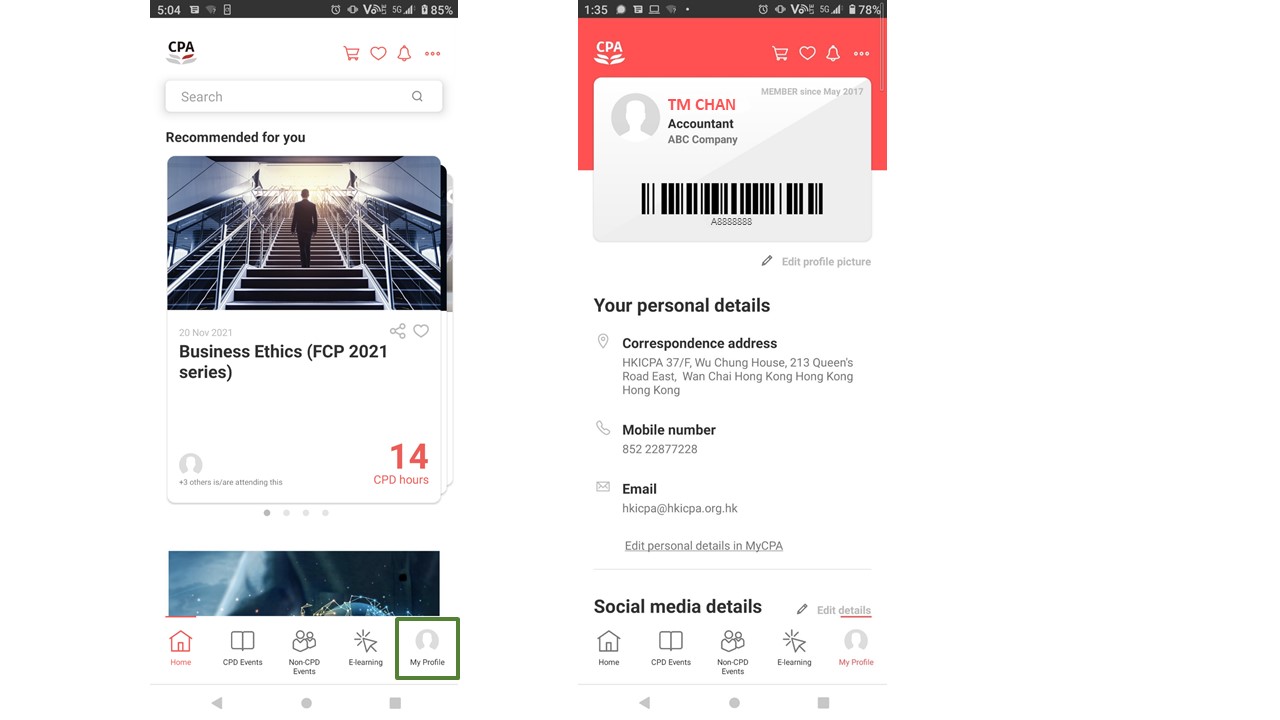 您的电子会员卡可在HKICPA活动应用程式中使用,让您轻松登记HKICPA活动或享受公会特别安排的活动 商户折扣优惠。
